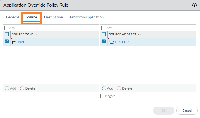 - Go to Source and add the Source Zone. Specify a Source Address (see example) if the source is a static address; otherwise, leave as Any.