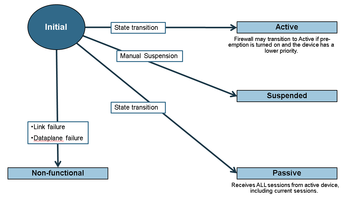 Lorsque le deuxième pare-feu est configuré pour High Availability (HA) et ajouté au groupe, il commence à l’État INITIAL. Une fois que l’appareil a terminé l’initialisation et HA contrôle des liens sont établis, le pare-feu passera à l’état passif. Une fois que le pare-feu est dans l’état passif, il commence à recevoir des informations de synchronisation de session pour * tous * les séances (sauf ICMP) sur le périphérique actif. Notez que cela n’arrivera que si il n’est pas une condition d’échec qui empêche le pare-feu de devenir fonctionnels. Le diagramme ci-dessous montre les transitions d’état possible d’INITIAL pour le deuxième pare-feu dans le scénario ci-dessus.
