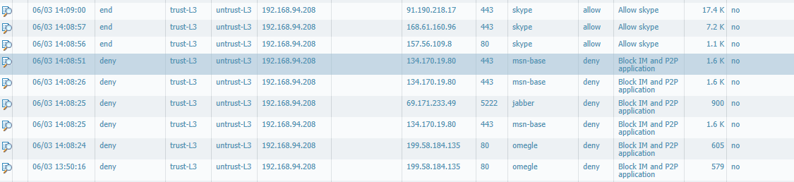 para verificar la configuración, ver el ejemplo siguiente mostrando los registros de tráfico que indica Skype se permite, mientras que omegle (sitio web de chat en línea), y Jabber están siendo bloqueados: