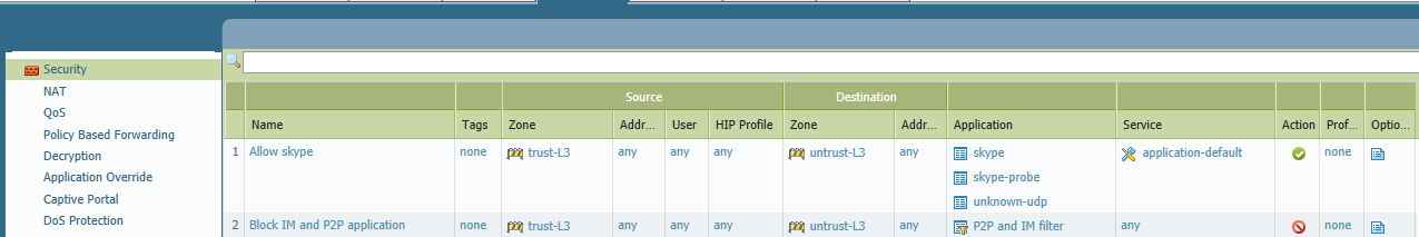 - Configure dos reglas de seguridad para permitir primero Skype, y negar el resto de aplicaciones de mensajería instantánea y P2P