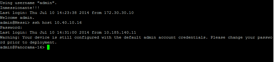 以下のスクリーンショットで、ユーザー名 admin は、ファイアウォール172.30.30.10 に SSH に使用されました。デバイス10.40.10.16 に SSH をしようとすると、ファイアウォールは、ユーザー名を入力する任意のオプションを与えるものではありません。また、ユーザ名 admin を使用して、ユーザーがデバイス10.40.10.16 に SSH にパスワードを入力する必要があるパスワードを要求:
