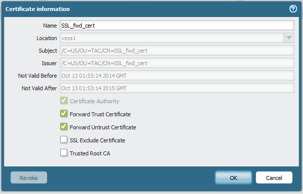 Une fois généré, ouvrez le certificat (onglet Device > Certificate Management > certificats) et cochez deux options: transférer