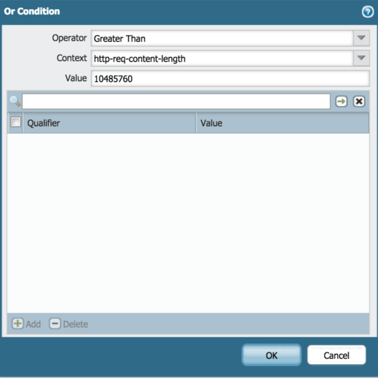 Inside “Or Condition” window, choose Operator to “Greater Than”, chooseContext to “http-req-content-length”. To limit file size up to 10 MB, we need to fill-in the Value in bytes, 10MB equals to “10485760”