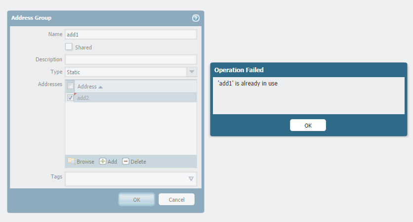 Si se crea un grupo de direcciones denominado add1, aparece el siguiente error: