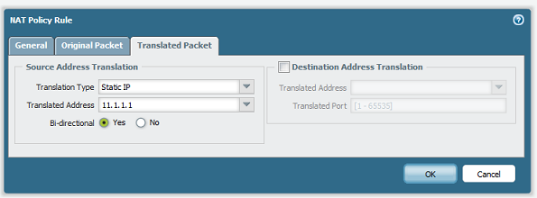 Die Auswahl von "Ja" für die bidirektionale erstellt die Kartierung in beide Richtungen auf der Grundlage der angegebenen Quell Zonen. Wenn die Bi-direktionale auf Nein gesetzt ist, dann wird die Kartierung nur auf der Grundlage der Richtung der source\-Zielzonen erstellt. Statische NAT-Richtlinien für öffentlich exponierte Server haben in der Regel eine bidirektionale auf Ja gesetzt, so dass der ausgehende Traffic für den Server die gleiche Adresse wie der Inbound-Traffic verwendet: