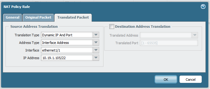 Pour une adresse IP source donnée, le pare-feu de Palo Alto Networks traduit l'adresse IP source ou la plage en une seule adresse IP. Le mappage est basé sur le port source, de sorte que plusieurs IPS source peuvent partager une seule adresse traduite jusqu'à ce que les ports sources aient été épuisés. Ceci est typique lorsque vous n'avez qu'une seule adresse IP publique à partager entre plusieurs adresses IP privées. Il est courant de choisir l'adresse IP attribuée à l'interface qui se connecte à votre FAI: