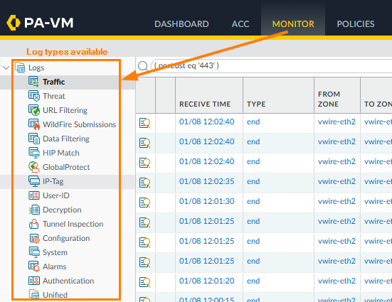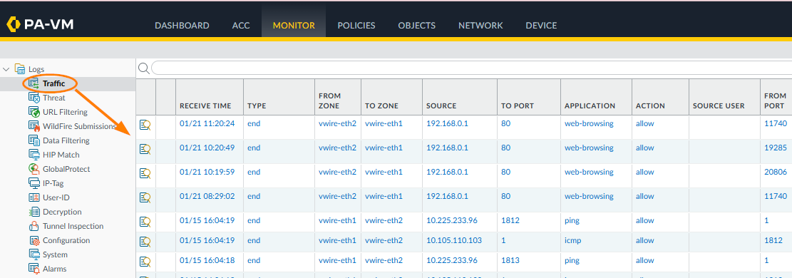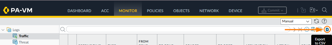 Go to Monitor>Logs section, then select the type of log you want to export. In the example below, Traffic logs are selected.