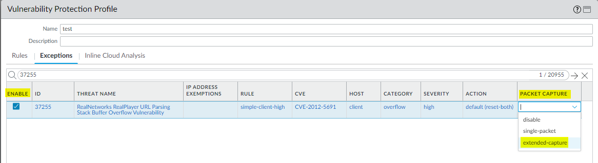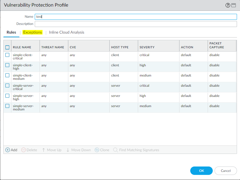 Step 3. Open the Vulnerability Protection Profile and head over to the 'Exceptions' tab.