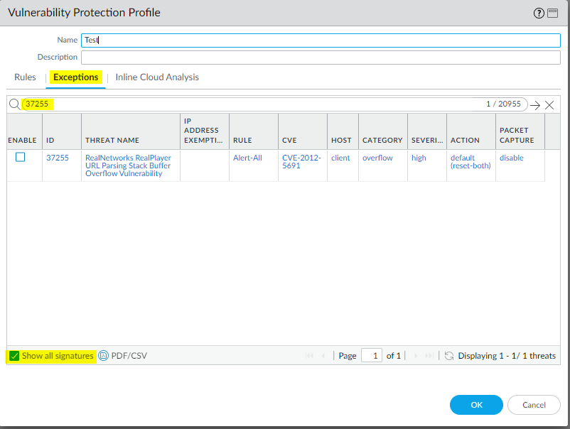 Step 4. Search for the Threat ID of the signature in question, and click on the lower-left checkbox "Show all signatures".