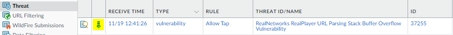 Step 7. Rerun the suspicious traffic, and verify the newly written Threat log entries. There will be a green down-pointing arrow at the left of the Threat log entry, from where the automatically collected PCAP file can be exported.