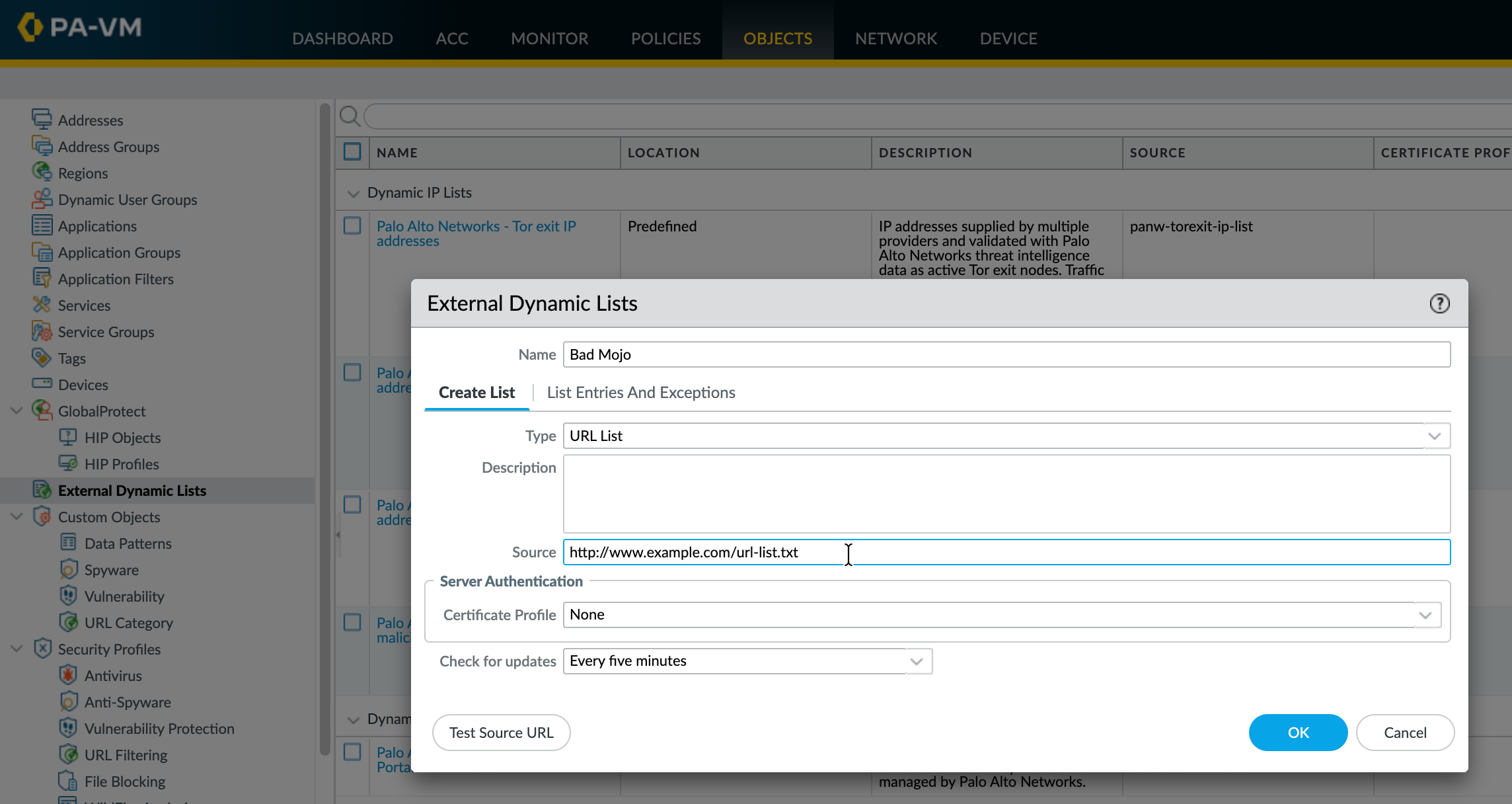To create a new External list, navigate to Objects > External Dynamic Lists > Add. I used 'Bad Mojo' as the name. Add the external Source. I used "http://www.example.com/url-list.txt". Also, notice the 'repeat', which is set to 'Five Minute' as the refresh rate for this external list.