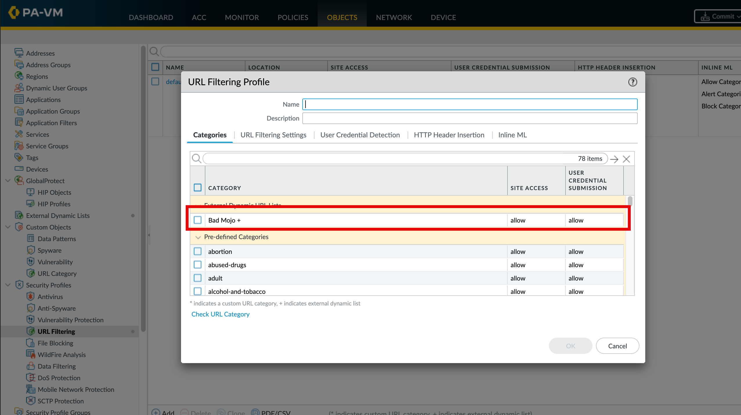 Step 2. To create a New URL Filtering Profile inside Objects > Security Profiles > URL Filtering > Add a new profile. Scroll to the bottom to see the newly created list.