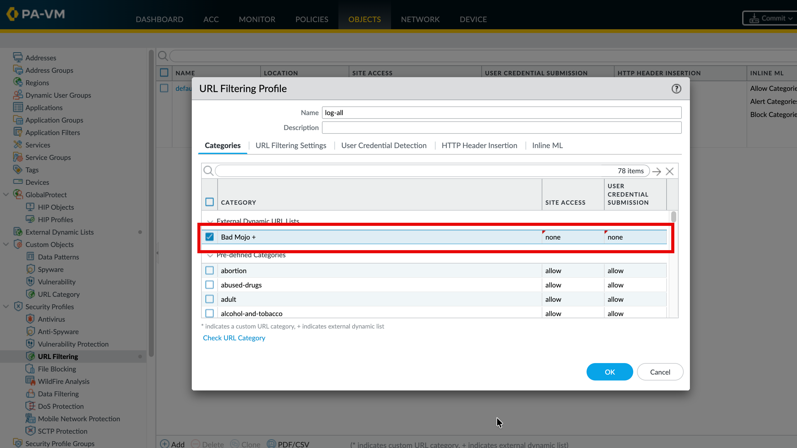 Step 3. To edit an existing profile, choose Objects > Security Profiles > URL Filtering, and edit it by clicking on the name.