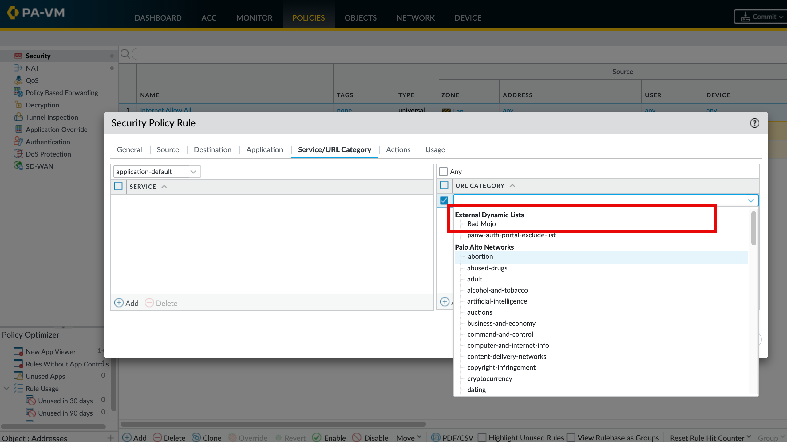 Step 4. Inside  a Security Policy View (Policies > Security), click on a rule name to edit the rule, then inside the Service/URL Category, you will see the Bad Mojo list under External Dynamic Lists: