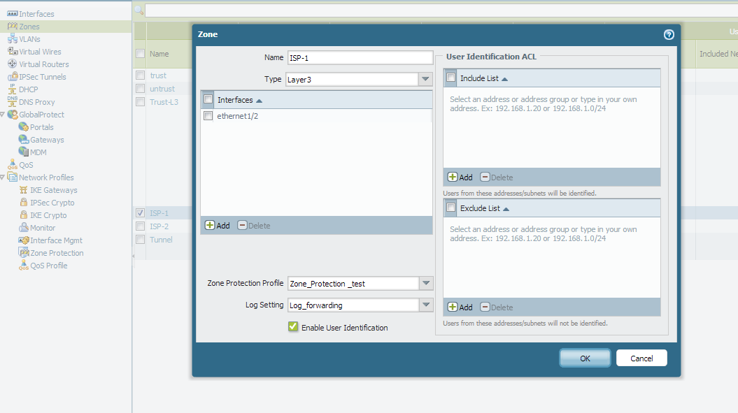 このシナリオでは、ゾーンが追加され、パケットベースの攻撃保護を備えたゾーン保護プロファイルが作成されました。