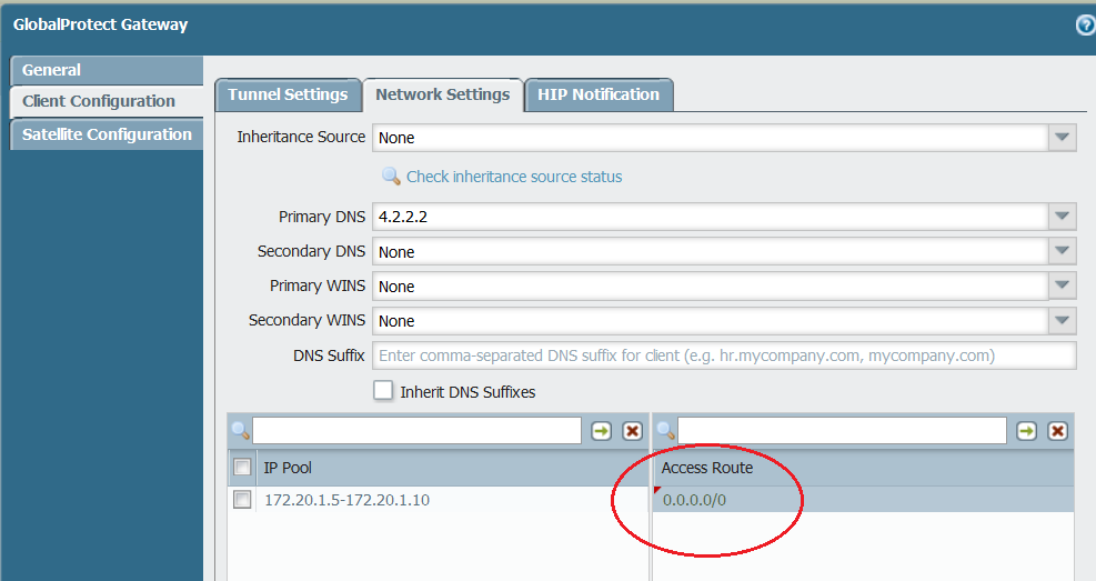 - Disable split tunneling by setting the access route to 0.0.0.0/0 in the Global Protect Gateway settings