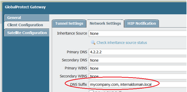- L'autre option consiste à configurer un suffixe DNS pour les zones qui doivent être résolues par les serveurs DNS configurés dans le portail GlobalProtect. Cela forcera le périphérique iOS à utiliser le serveur DNS émis par GlobalProtect pour le zones\domains défini dans le suffixe. Toutes les autres requêtes utiliseront les paramètres DNS configurés localement.