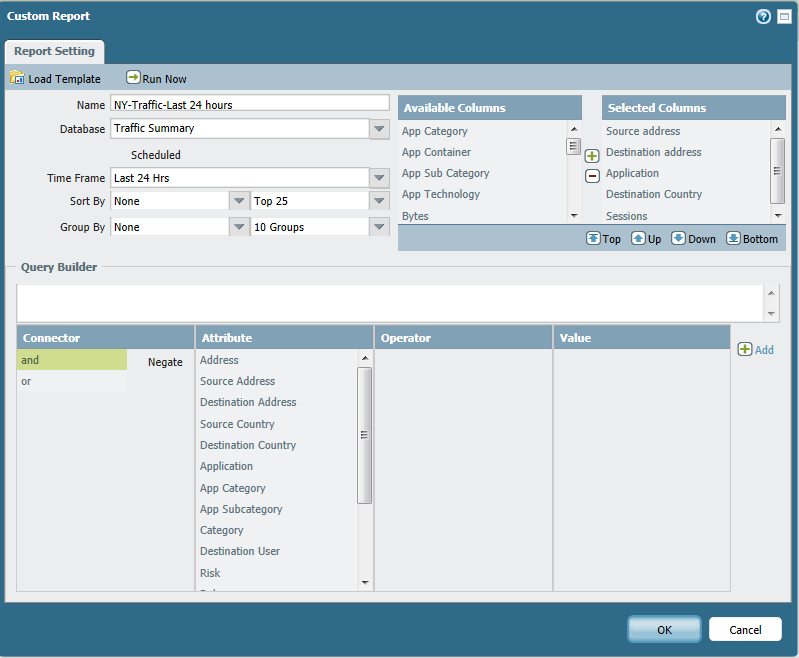 - Sous moniteur > gérer les rapports personnalisés, créez un rapport personnalisé comme désiré. L'exemple suivant présente un rapport créé pour le résumé du trafic pour les dernières 24 heures