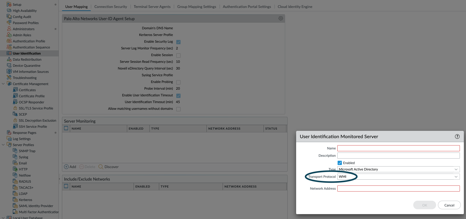Additional WMI configuration can also be found on the “Device > user identification > User mapping > Server monitoring > User identification monitored server > Transport protocol” section of the config, pls see screenshot below for reference