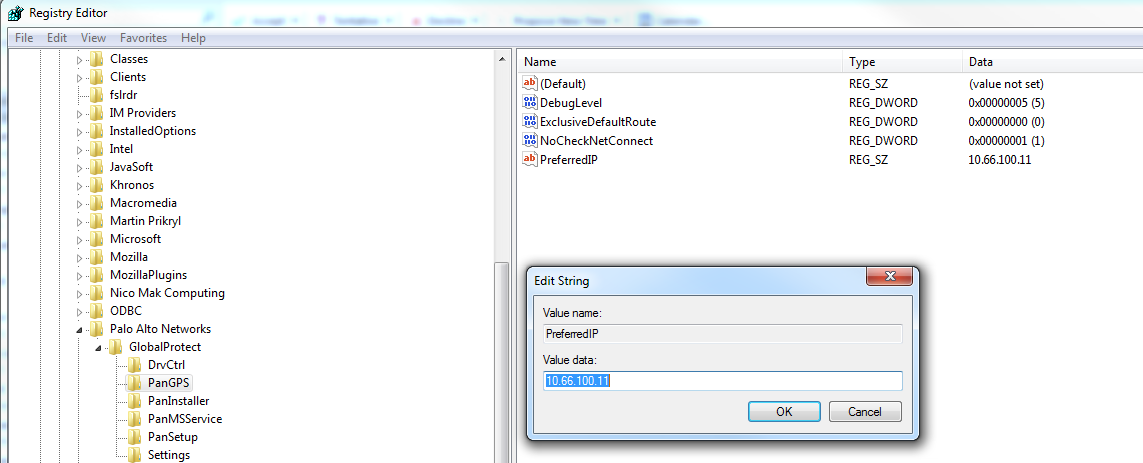 - パロアルトネットワーク > GlobalProtect > PanGPS > PreferredIP をダブルクリックし、目的の IP に変更し、[OK] をクリックします。
