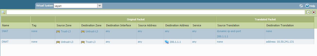 Create a "No NAT" rule for traffic from internal LAN (Trust_L3) to the firewall IP address (200.1.1.1), as shown below.