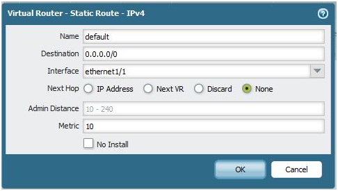 Sur le pare-feu de Palo Alto Networks, configurez un itinéraire par défaut sans un saut suivant.