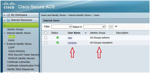 7 です。[ユーザーと id ストア] > [グループの識別] > [ユーザー] を使用して、radius サーバーでユーザーを作成し、それらをそれぞれの id グループに与えることができます。ここで私は、管理者と nonadmin グループに指摘されている2つのユーザーを作成している。
