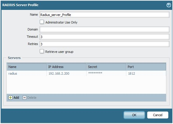 1。WebGUI の内部で、[デバイス] > [サーバープロファイル] > [radius] に移動し、radius サーバープロファイルを作成し、セカンダリ radius サーバー (バックアップ) がある場合は追加できます。RADIUS 名、IP アドレス、シークレットを追加し、ポートを確認してください。