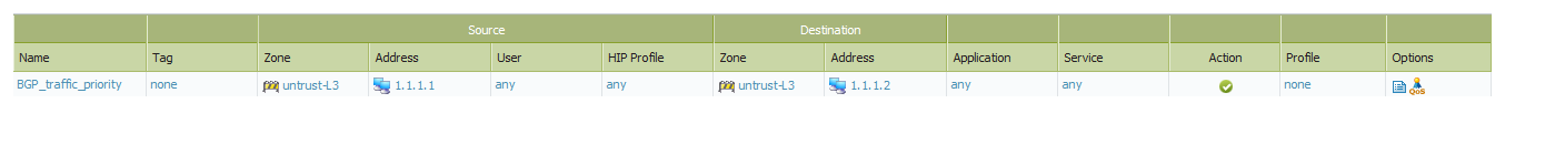 Eine Sicherheitspolitik muss so konfiguriert werden, dass Sie dem BGP-Traffic entspricht, und dann die DSCP-Informationen in die politischen Optionen einstellen. Der BGP Peering wird zwischen 1.1.1.1 und 1.1.1.2 gegründet, wobei 1.1.1.2 der entfernte Peer ist.