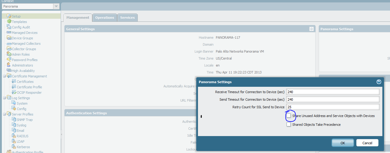 - Décochez la case "partager les objets d'adresse et de service inutilisés avec des périphériques" dans les paramètres Panorama comme indiqué: