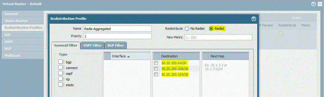 Step1: Configure the Redistribution Profiles with Destination as the Routes that need to be aggregated or summarized.