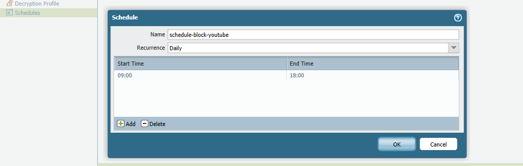 # set schedule schedule-block-youtube recurring daily 09:00-18:00