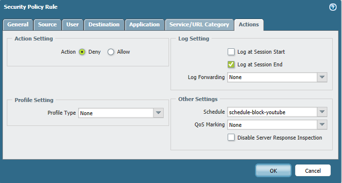 # set rulebase security rules block-youtube from L3-Trust to L3-Untrust source any destination any application youtube schedule schedule-block-youtube service any log-end yes action deny