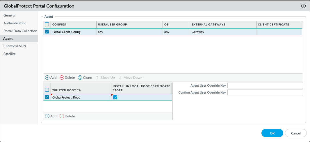 - Root CA certificate(s) are added and Install in Local Root Certificate Store option is checked under Network > GlobalProtect Portal > Agent > Trusted Root CA