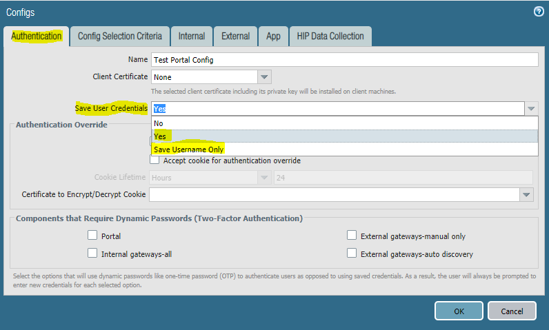 - Under the Global Protect Portal -> Configs -> Authentication tab, the "Save User Credentials" is set to "Yes" (saving both username and password) or to "Save Username Only"