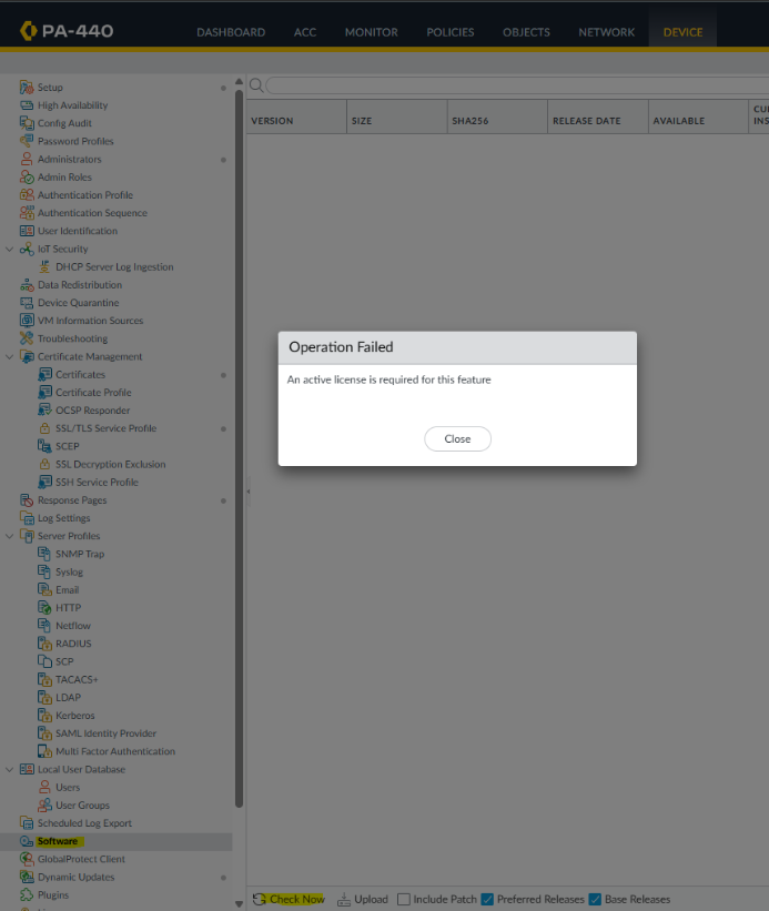 - This happens when using the "Check Now" under the firewall GUI: Device > Software