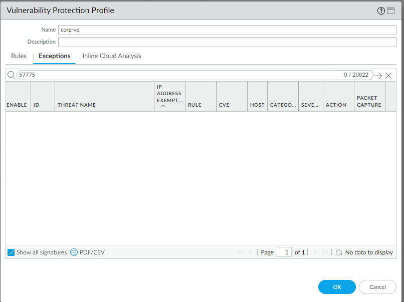 - For example, threat ID 57775 can't be found through the firewall's UI as follows.