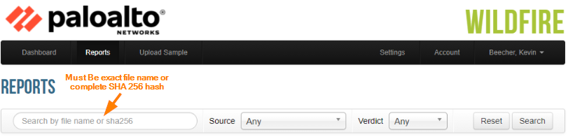 Please Note: Currently when searching by hash or file name, the complete file name or SHA256 hash must entered (partial name or hash will not work)