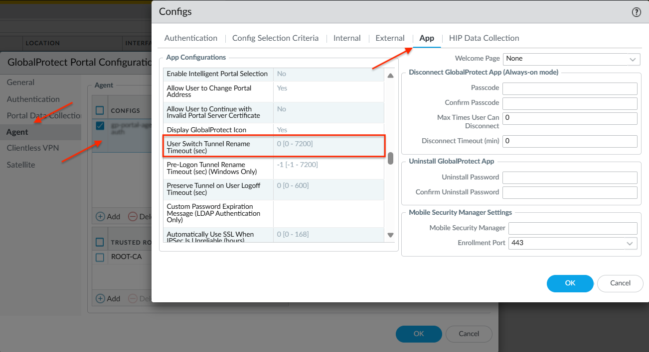 - Set the "User Switch Tunnel Rename Timeout" value above 0 in the "Global Protect Portal" settings based on the required security level.