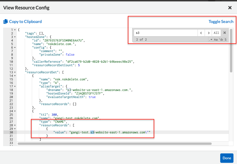 - 如果“CNAME”类型中有 2 个或更多 DNS 记录条目指向已删除的 S3 存储桶,则需要嵌套数组 RQL 语法支持。