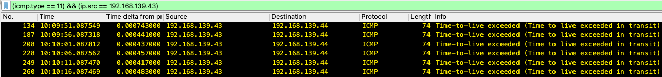 - Dans la packet capture (capture de paquet - pcap) effectuée sur le FW-B, les paquets ICMP dépassés dans le délai de sortie sont observés envoyés du BDR au FW.