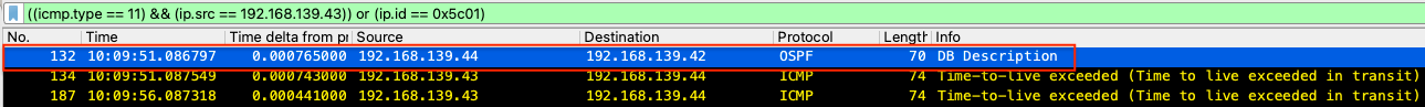 - 检查 ICMP 部分中TTL超出数据包的详细信息将告诉我们从防火墙发送到DR路由器的OSPF数据包在传输过程中丢失了。