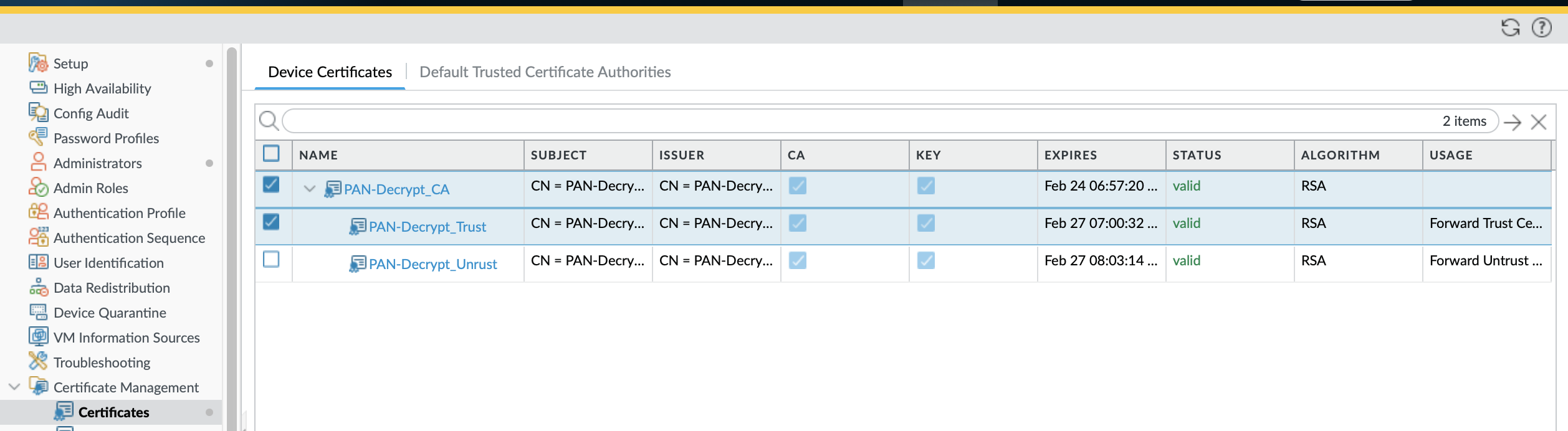 - La siguiente cadena de certificados, el descifrado SSL, se realiza con el certificado de CA intermedio, 'PAN-Decrypt_Trust'.