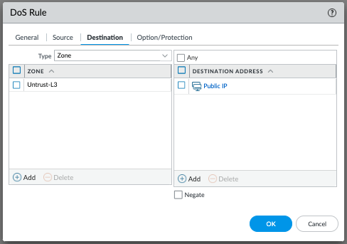 c.[Richtlinien > DoS-Schutz > hinzufügen ] Ziel: Legen Sie Zone Untrusted und Zieladresse fest: [Öffentliche IP]