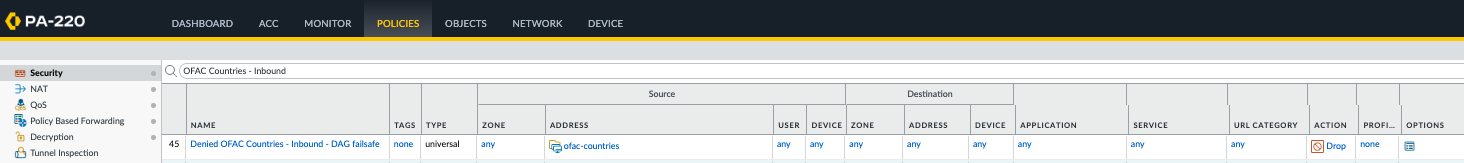 f.Hinzufügen einer DoS-Richtlinie zur Aktion Verweigern Sie alles, was mit der Quelladresse übereinstimmt: ofac-countries (time ip-tagged dynamic address group)