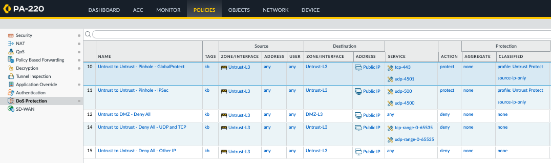 DoS-Regelname: Nicht vertrauenswürdig zu nicht vertrauenswürdig - Pinhole - GlobalProtect