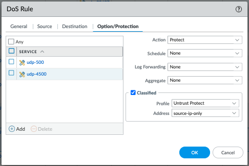 d. [Richtlinien > DoS-Schutz > Hinzufügen ] Option/Schutz: Wenn Sie anderen IP-Datenverkehr blockieren möchten, legen Sie Aktion auf Verweigern fest. Wenn Sie anderen IP-Datenverkehr (z. B. ICMP und ESP) zulassen möchten, legen Sie die Aktion auf Zulassen fest.