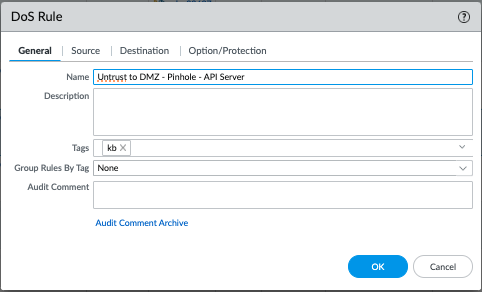 a. [Richtlinien > DoS-Schutz > hinzufügen ] Allgemein: Legen Sie den Namen der DoS-Richtlinie Untrusted auf DMZ - Pinhole - <Service>