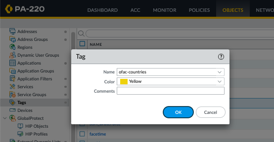 e. Définissez l’action intégrée. Ici, nous avons marqué l'adresse IP source avec 'ofac-countries' pendant 480 minutes. Après l’expiration, l’entrée sera supprimée du groupe d’adresses dynamiques.