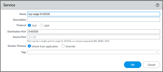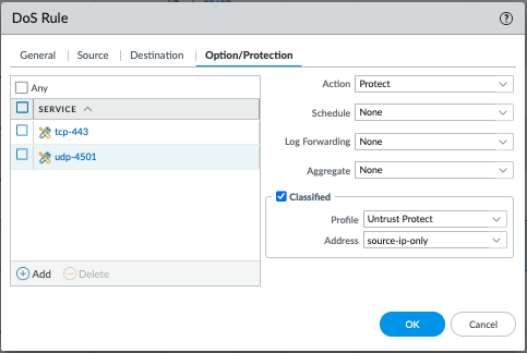 [Stratégies > Protection DoS > Ajouter > option/Protection > Service] : udp-range-0-65535 et tcp-range-0-65535.
